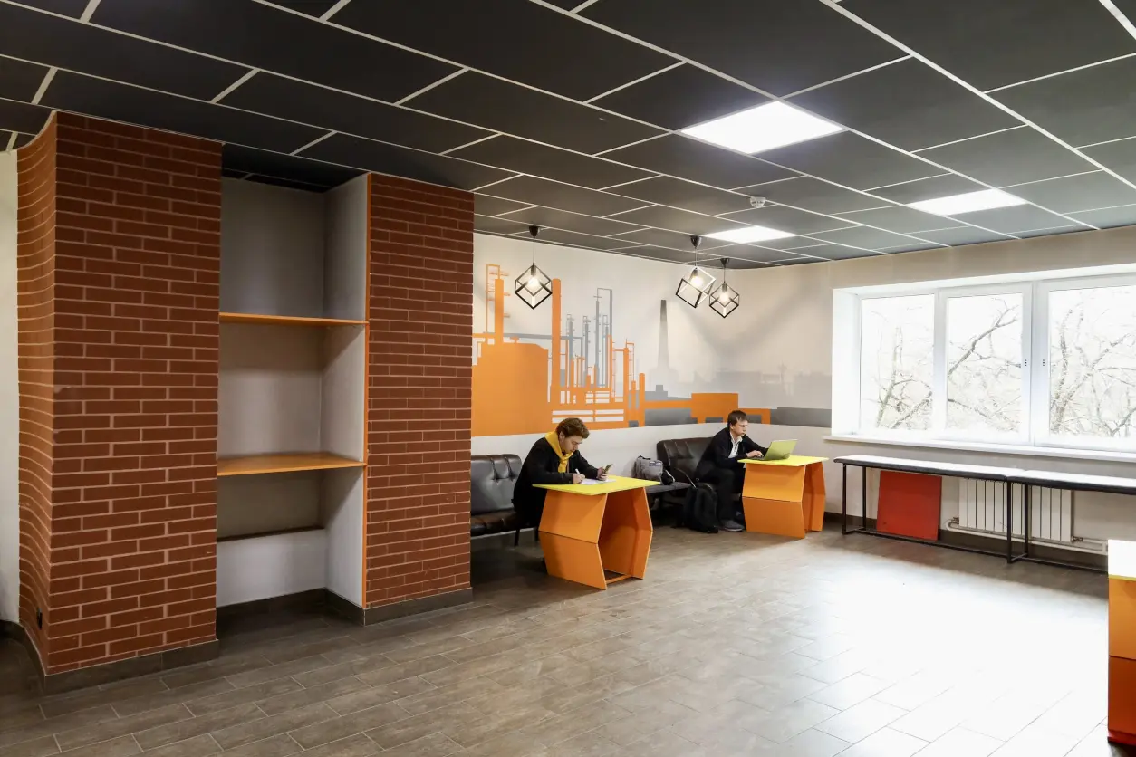 En SibGIU se han creado espacios para el descanso cómodo y el trabajo productivo de los estudiantes. Las zonas de salón están equipadas con muebles modernos y ergonómicos, se ha previsto una gran cantidad de enchufes para cargar gadgets. Aquí los estudiantes pueden descansar, comunicarse y reunirse en grupos para preparar proyectos.