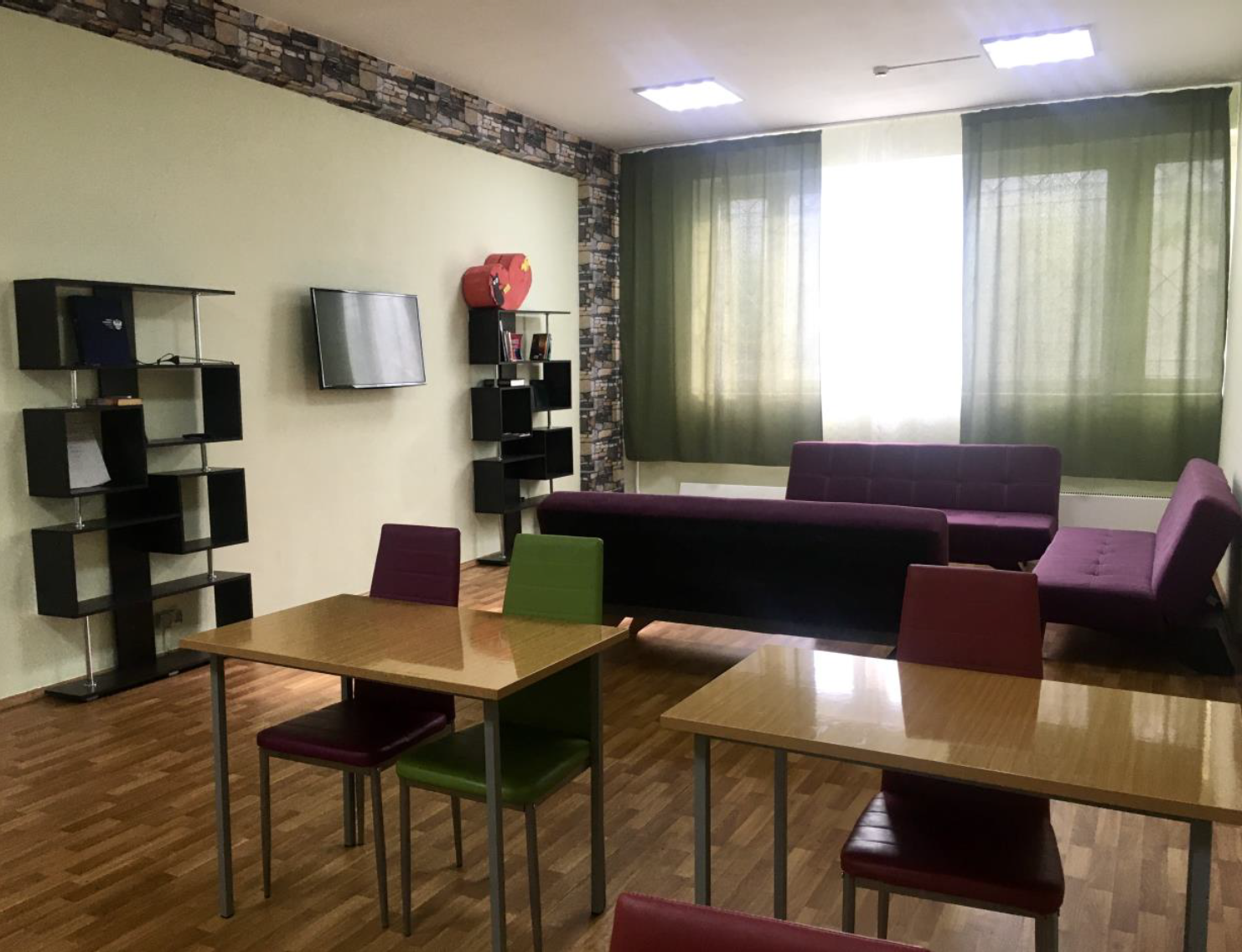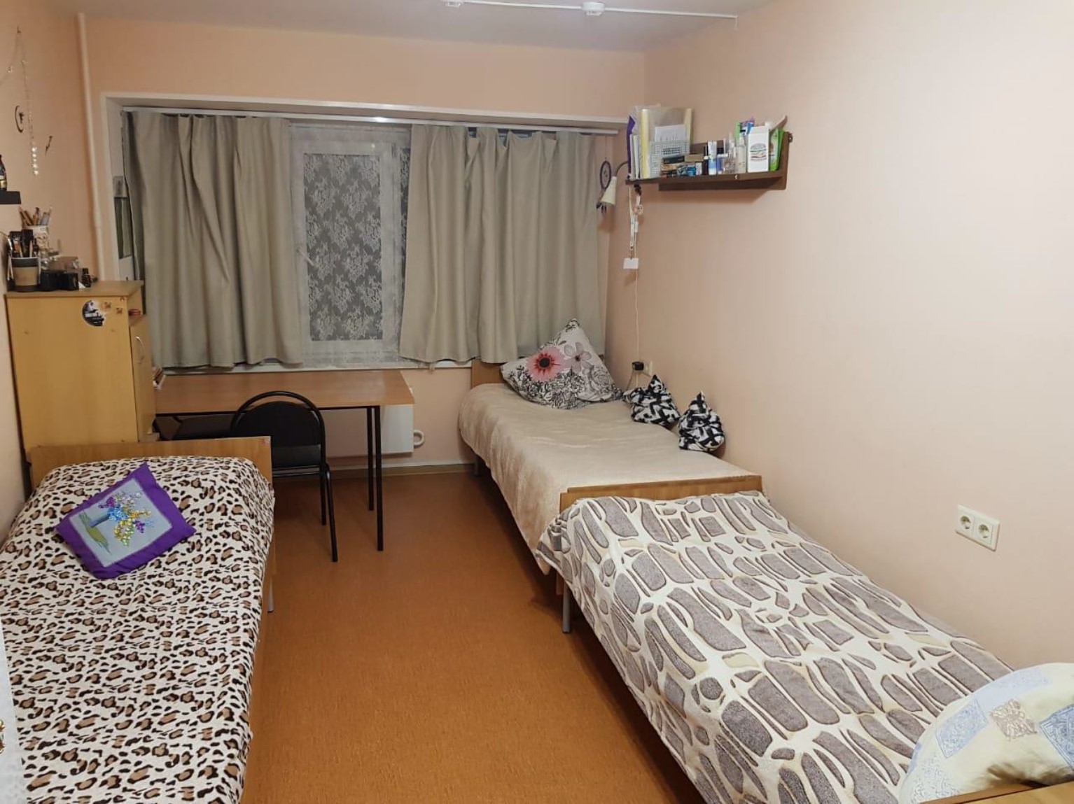 Nella stanza per ogni insegnante c'è: un tavolo, una sedia, un comodino, un letto (può essere a un piano o a due piani), un armadio. Gli utensili da letto ( materasso di cotone, set di biancheria da letto, coperta, coperta e cuscino) possono essere ottenuti. Apparecchi elettrici e domestici consentiti da portare con sé: frigorifero (con una durata non superiore a 7 anni e in buone condizioni), forno a microonde, multicooker (fornello di riso), bollitore elettrico, ferro da stiro, asciugacapelli, TV, aspirapolvere. Tutte le cucine dei dormitori sono dotate di fornelli a induzione, tenete conto di questo quando scegliete i piatti.