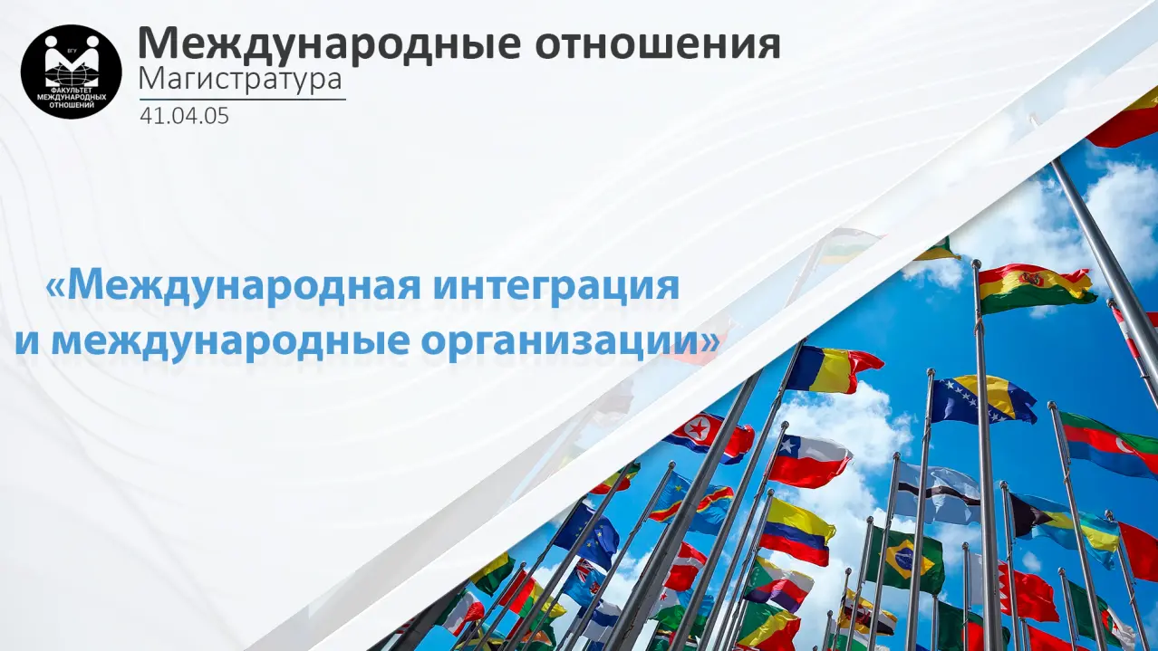 Магистрдик программа «Эл аралык интеграция жана эл аралык уюмдар» дүйнөлүк саясат жана дипломатия жаатында жогорку квалификациялуу адистерди даярдайт. Студенттер эл аралык мамилелер теориясын, дипломатиянын тарыхын, заманбап дүйнөлүк саясатты, эл аралык укукту жана эл аралык уюмдардын ишмердүүлүгүн терең изилдешет. Окуу аналитика, сүйлөшүүлөрдү жүргүзүү, эксперттик корутундуларды даярдоо жана эл аралык чөйрөдө стратегиялык пландоо көндүмдөрүн өнүктүрөт. Бүтүрүүчүлөр мамлекеттик органдарда, эл аралык түзүмдөрдө, дипломатиялык өкүлчүлүктөрдө, аналитикалык борборлордо жана эл аралык компанияларда иштөөгө даяр.