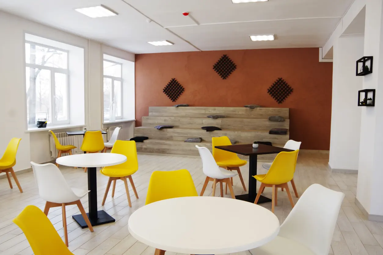 2 комфортабельных общежития на 700 мест с учебными комнатами, коворкингами, прачечными, кухнями и зонами отдыха. Капитальный ремонт и современное оснащение.